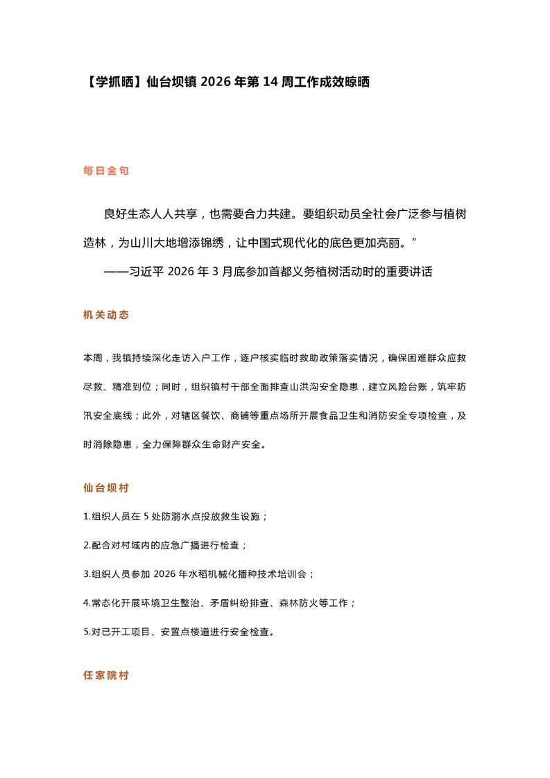 【学抓晒】仙台坝镇2026年第14周工作成效晾晒