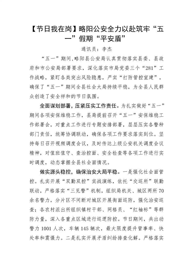 【节日我在岗】略阳公安全力以赴筑牢“五一”假期“平安盾”