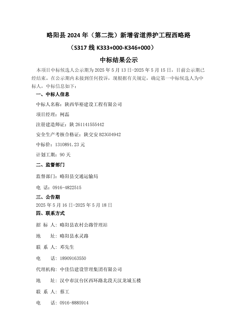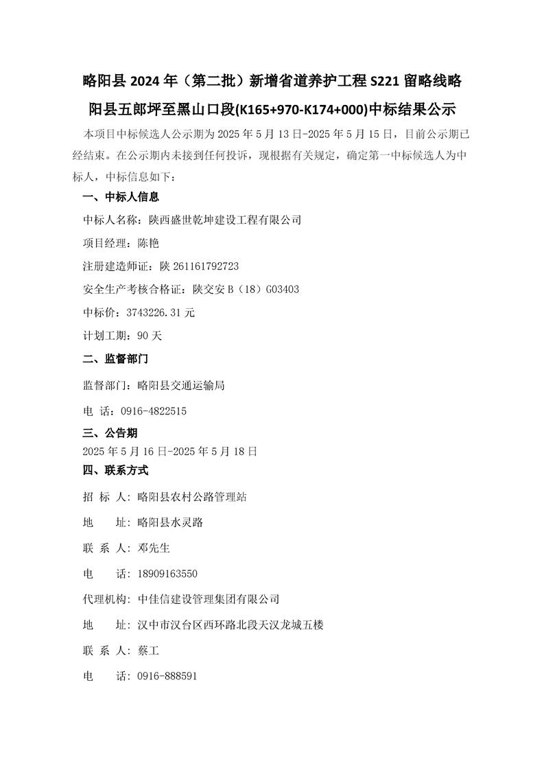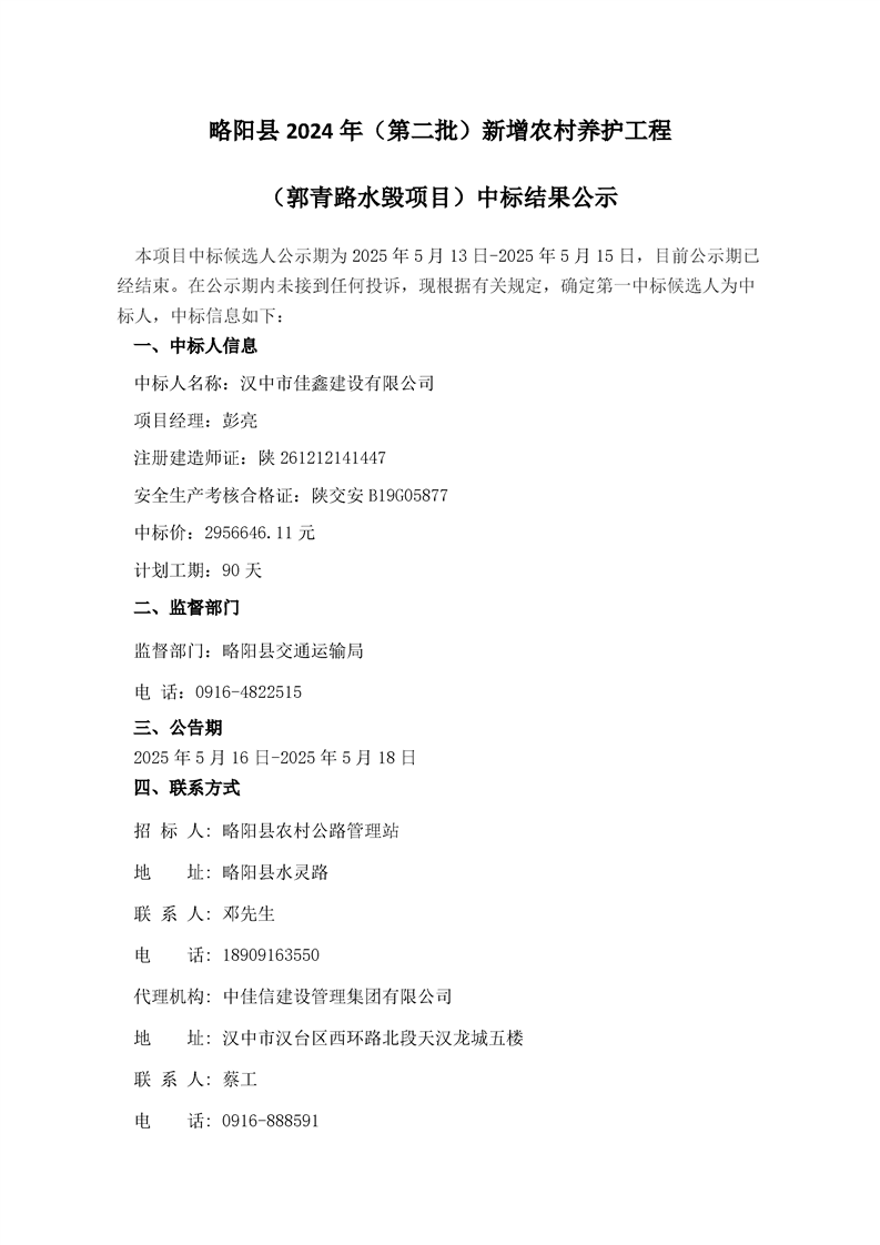 略阳县2024年(第二批)新增养护工程中标结果公示