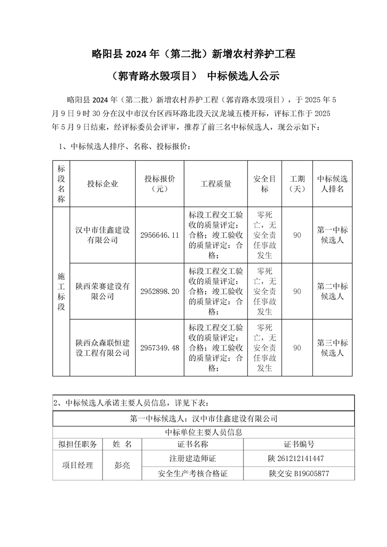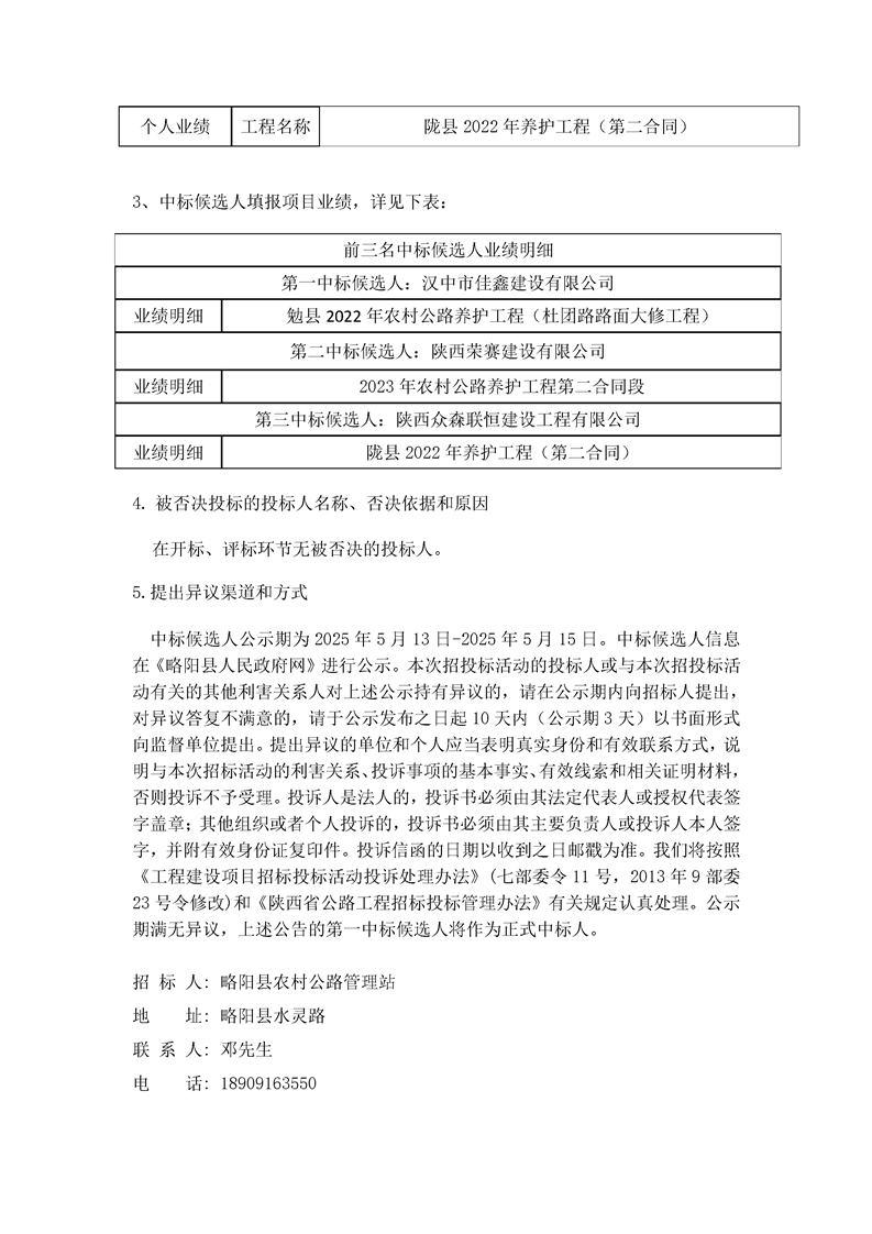 | 内容概述 | 略阳县2024年(第二批)新增农村养护工程(郭青路水毁项目) 中标候选人公示 | ||||