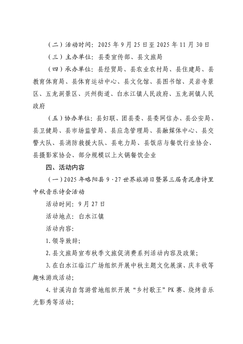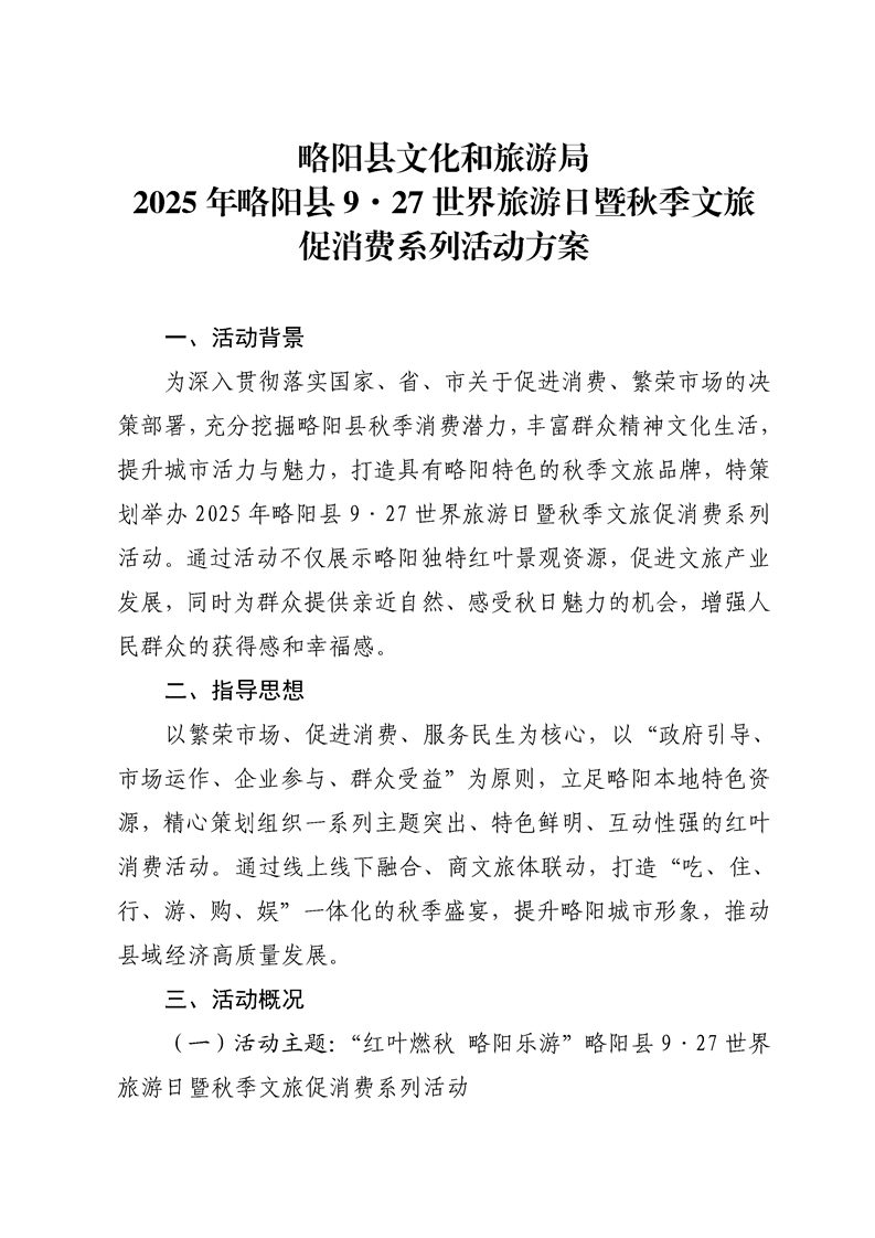 | 内容概述 | 略阳县文化和旅游局2025年略阳县9·27世界旅游日暨秋季文旅促消费系列活动方案 | ||||