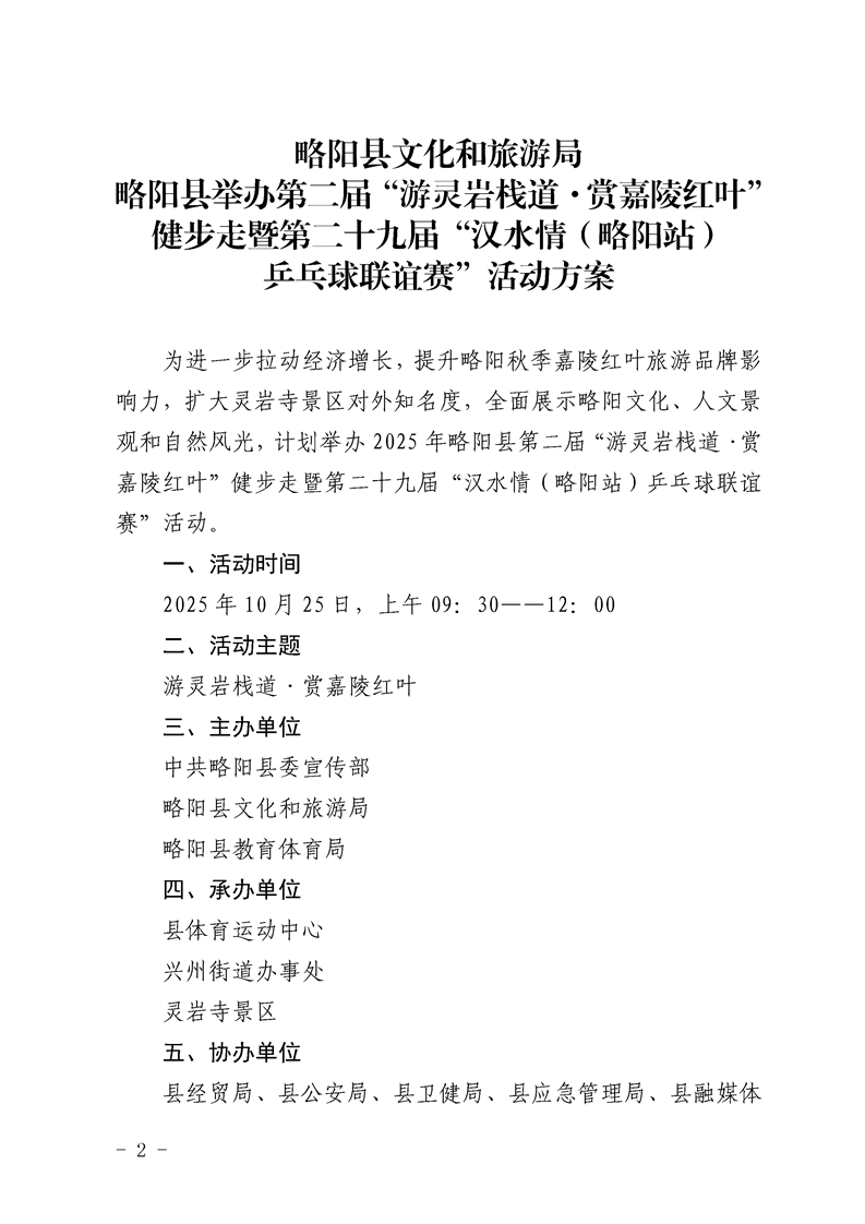 | 内容概述 | 略阳县文化和旅游局略阳县举办第二届“游灵岩栈道·赏嘉陵红叶”健步走暨第二十九届“汉水情(略阳站)乒乓球联谊赛”活动方案 | ||||