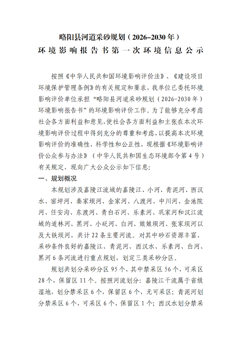 略阳县采砂规划(2026-2030年)环境影响报告书第一次环境信息公示