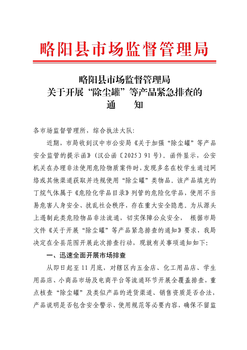 略阳县市场监督管理局关于开展“除尘罐”等产品紧急排查的通知