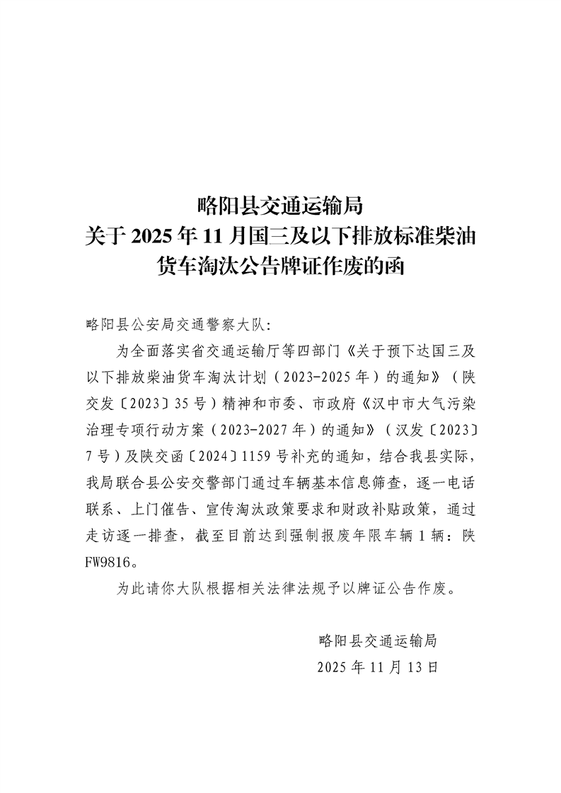 | 内容概述 | 略阳县交通运输局关于2025年11月国三及以下排放标准柴油货车淘汰公告牌证作废的函 | ||||