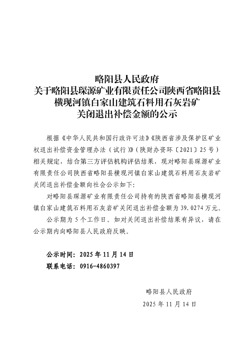 | 内容概述 | 关于略阳县琛源矿业有限责任公司陕西省略阳县横现河镇白家山建筑石料用石灰岩矿关闭退出补偿金额的公示 | ||||