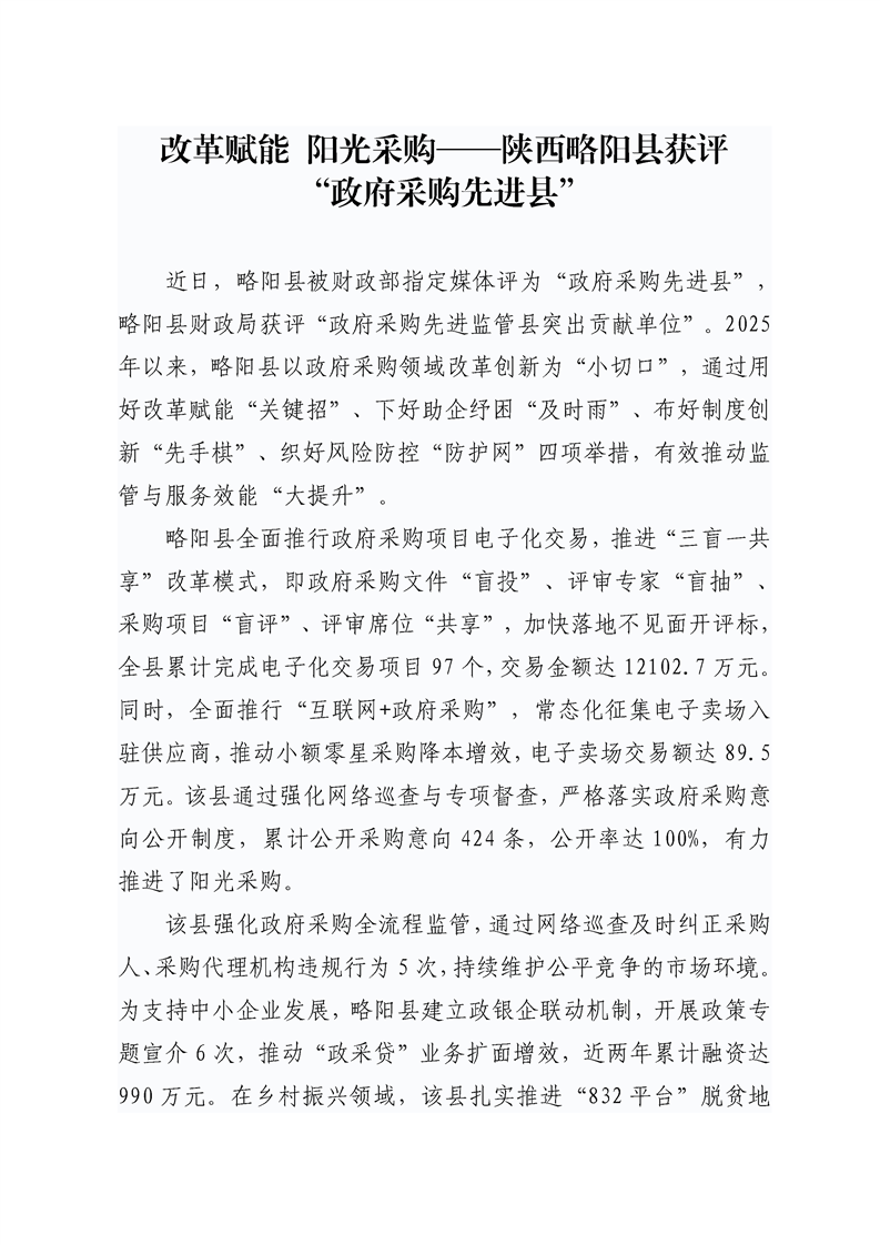 改革赋能 阳光采购——陕西略阳县获评“政府采购先进县”