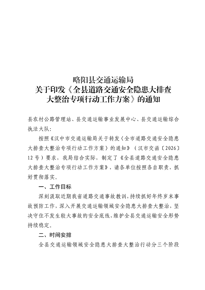 | 内容概述 | 略阳县交通运输局关于印发《全县道路交通安全隐患大排查大整治专项行动工作方案》的通知 | ||||