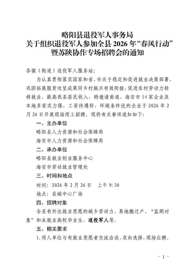 略阳县退役军人事务局关于组织退役军人参加全县2026年“春风行动”暨苏陕协作专场招聘会的通知