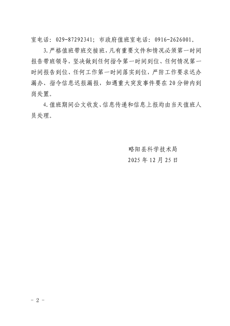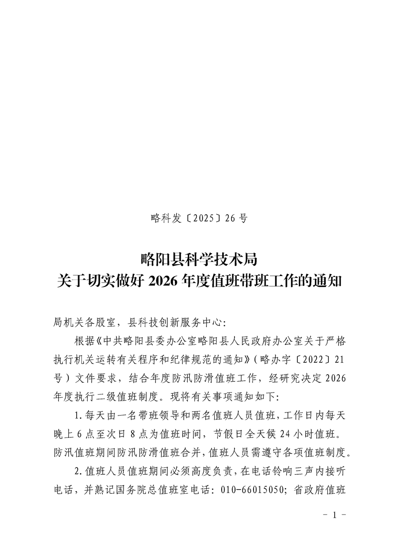 略阳县科学技术局关于切实做好2026年度值班带班工作的通知