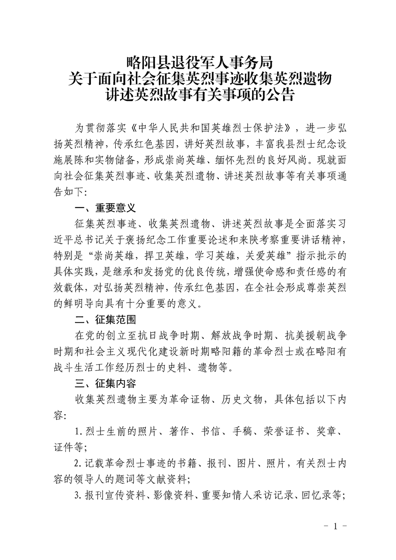 略阳县退役军人事务局关于面向社会征集英烈事迹收集英烈遗物讲述英烈故事有关事项的公告