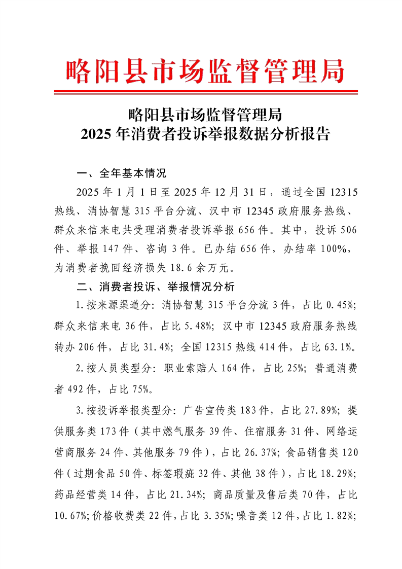 略阳县市场监督管理局2025年消费者投诉举报数据分析报告