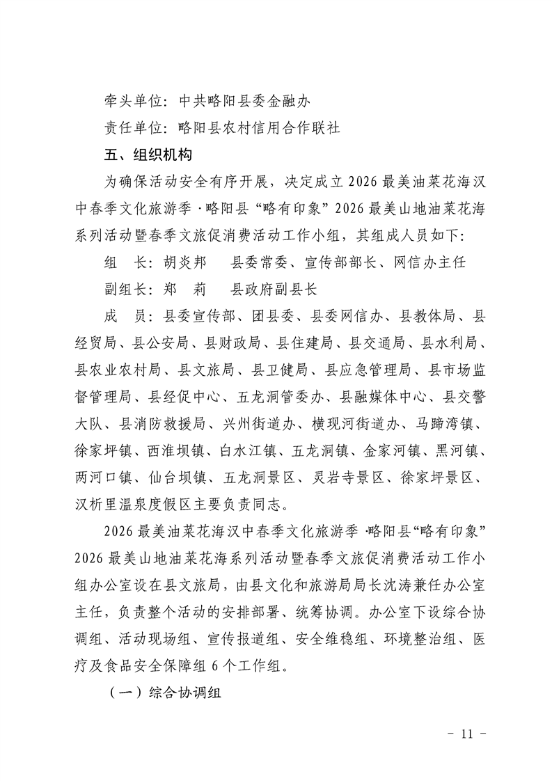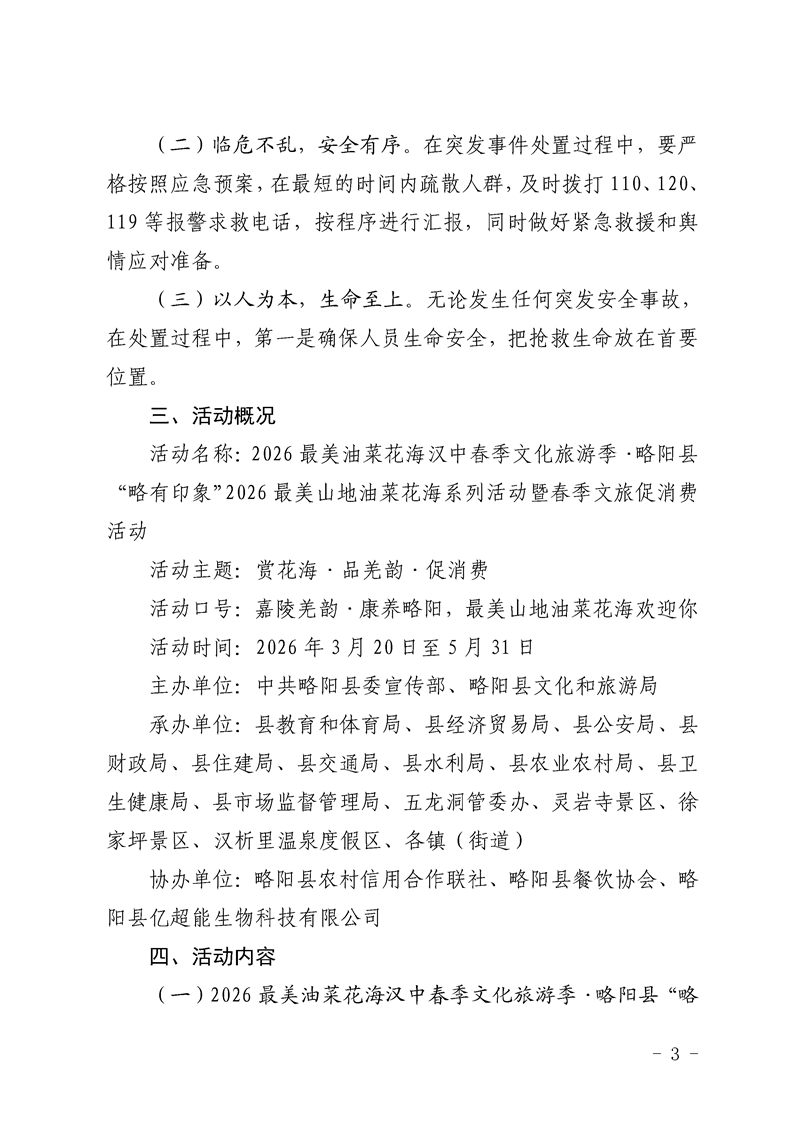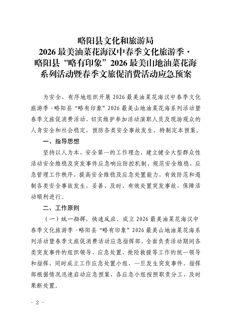 | 内容概述 | 略阳县文化和旅游局2026最美油菜花海汉中春季文化旅游季·略阳县“略有印象”2026最美山地油菜花海系列活动暨春季文旅促消费活动应急预案 | ||||
