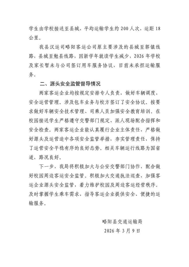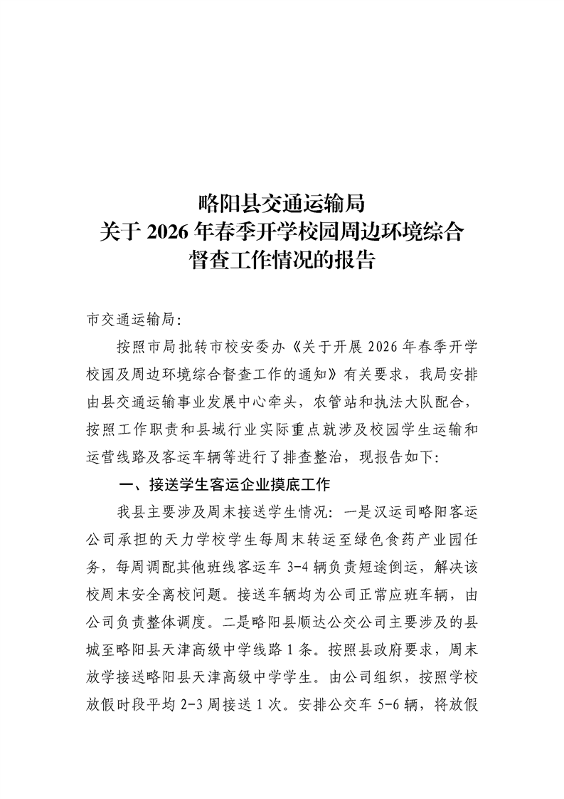 | 内容概述 | 略阳县交通运输局关于2026年春季开学校园周边环境综合督查工作情况的报告 | ||||