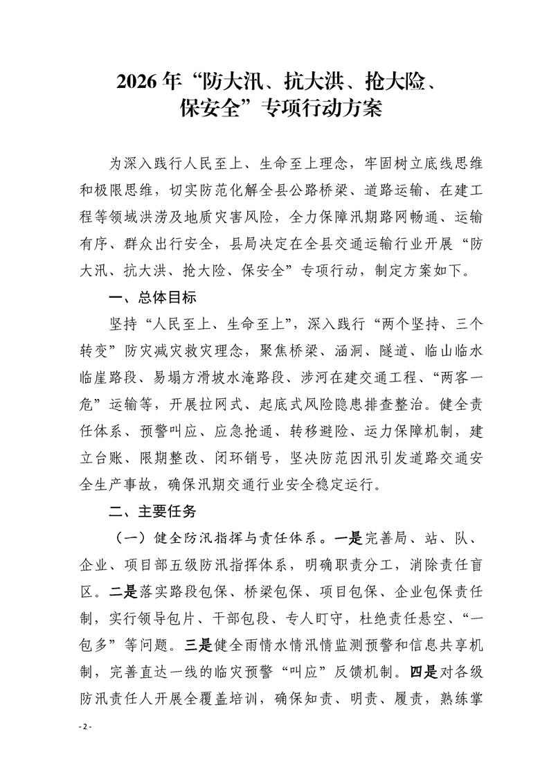 | 内容概述 | 略阳县交通运输局关于印发《2026年“防大汛、抗大洪、抢大险、保安全”专项行动方案》的通知 | ||||