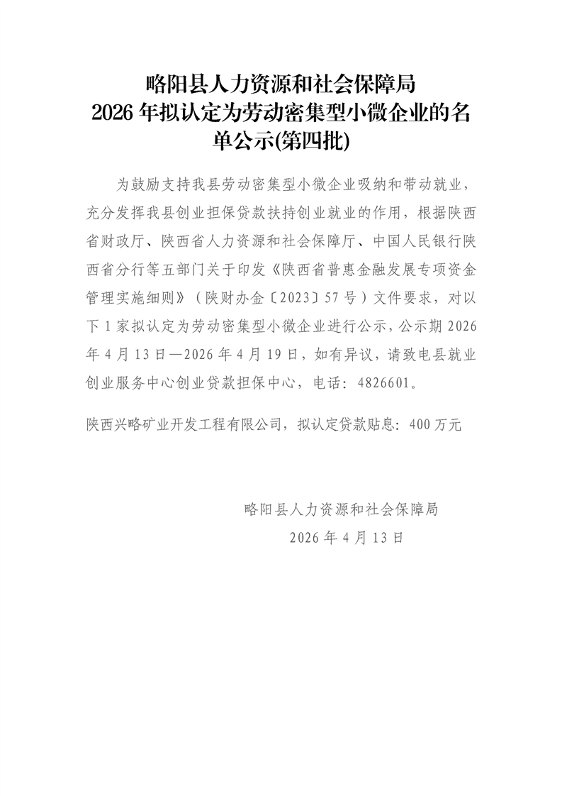 略阳县人力资源和社会保障局2026年拟认定为劳动密集型小微企业的名单公示(第四批)