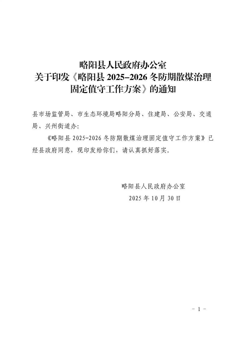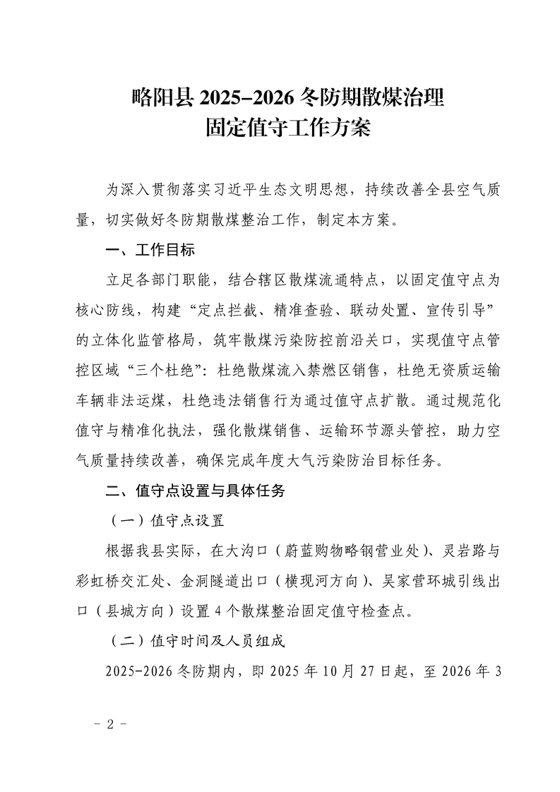 | 内容概述 | 略阳县人民政府办公室关于印发《略阳县2025-2026冬防期散煤治理固定值守工作方案》的通知 | ||||