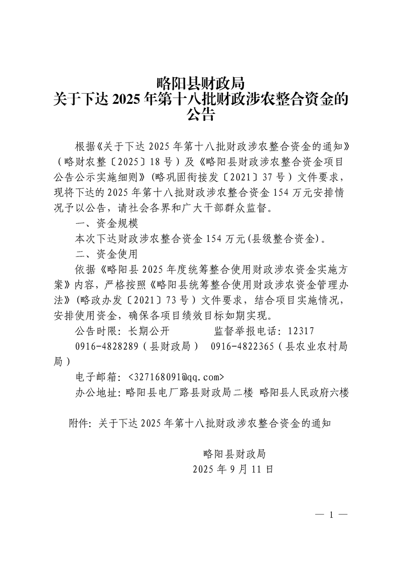 | 内容概述 | 略阳县财政局关于下达2025年第十八批财政涉农整合资金的公告 | ||||
