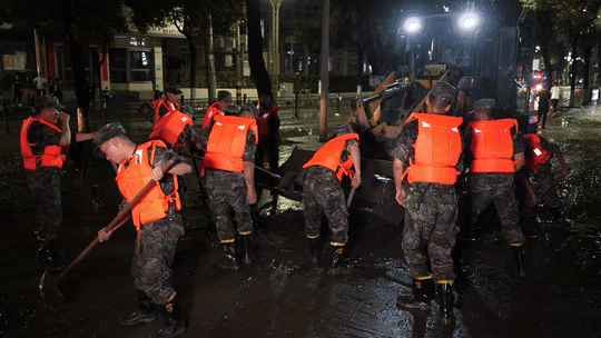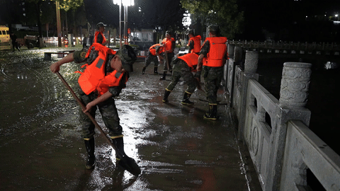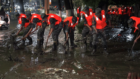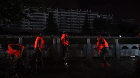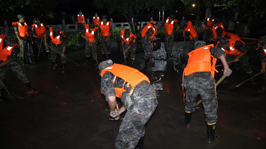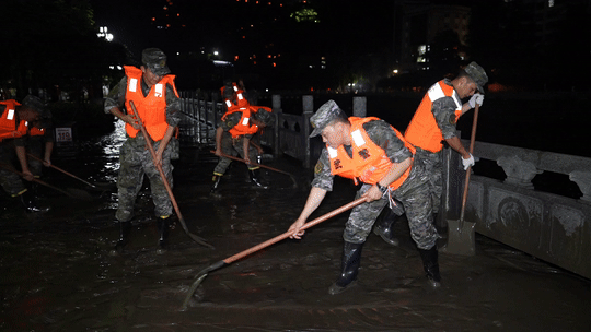 嘉陵江略阳段水位上涨洪峰过境导致城市内涝,洪水退去部分区域淤泥堆积,严重影响了居民的正常生活。关键时刻,武警官兵们迅速响应。“一二三,一二三……”20时45分,救援官兵按照分组、分区、分段作业的方式,齐心协力在县城狮凤路进行的清淤、排险、排水工作中,与淤泥展开了一场激烈的“战斗”。由于现场淤泥过多,官兵与当地党员干部一起使用木板、铁锹将各种垃圾、淤泥等废弃物堆到一起,对于难以清理的角落,官兵们直接用手进行清理,帮助受灾群众尽快恢复正常生产生活秩序。