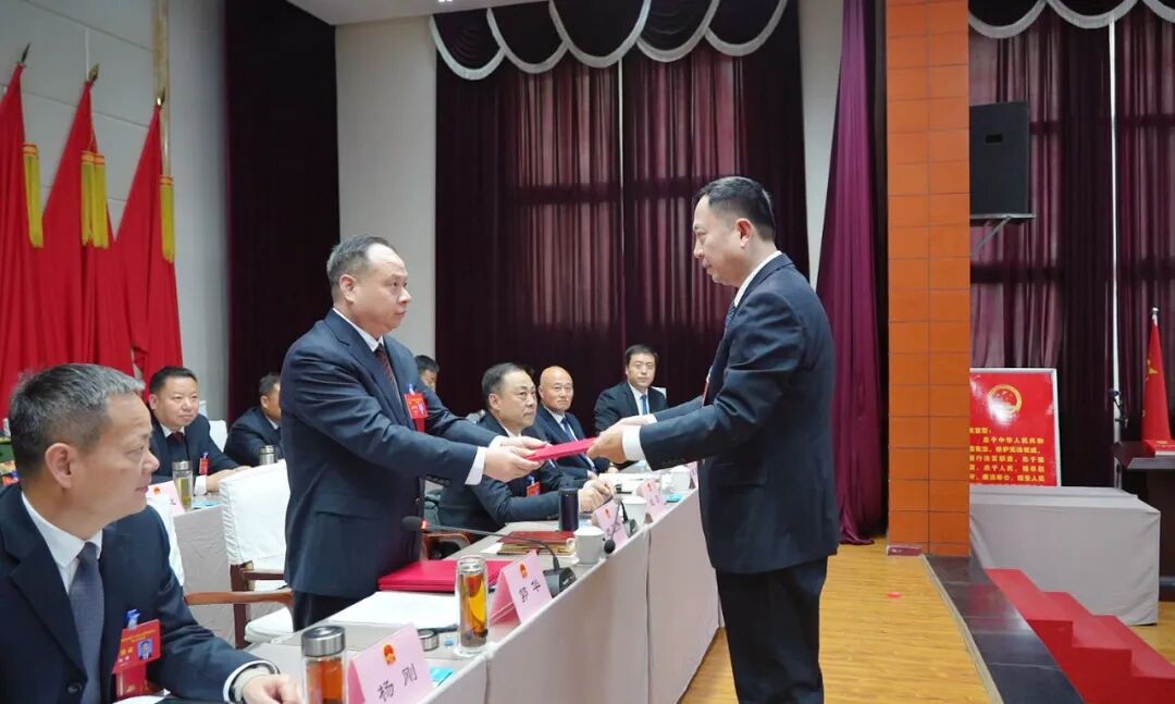 郭华向新当选县人大常务委员会主任赵玉杰和县人大常委会委员颁发当选证书,新当选人员向宪法宣誓。