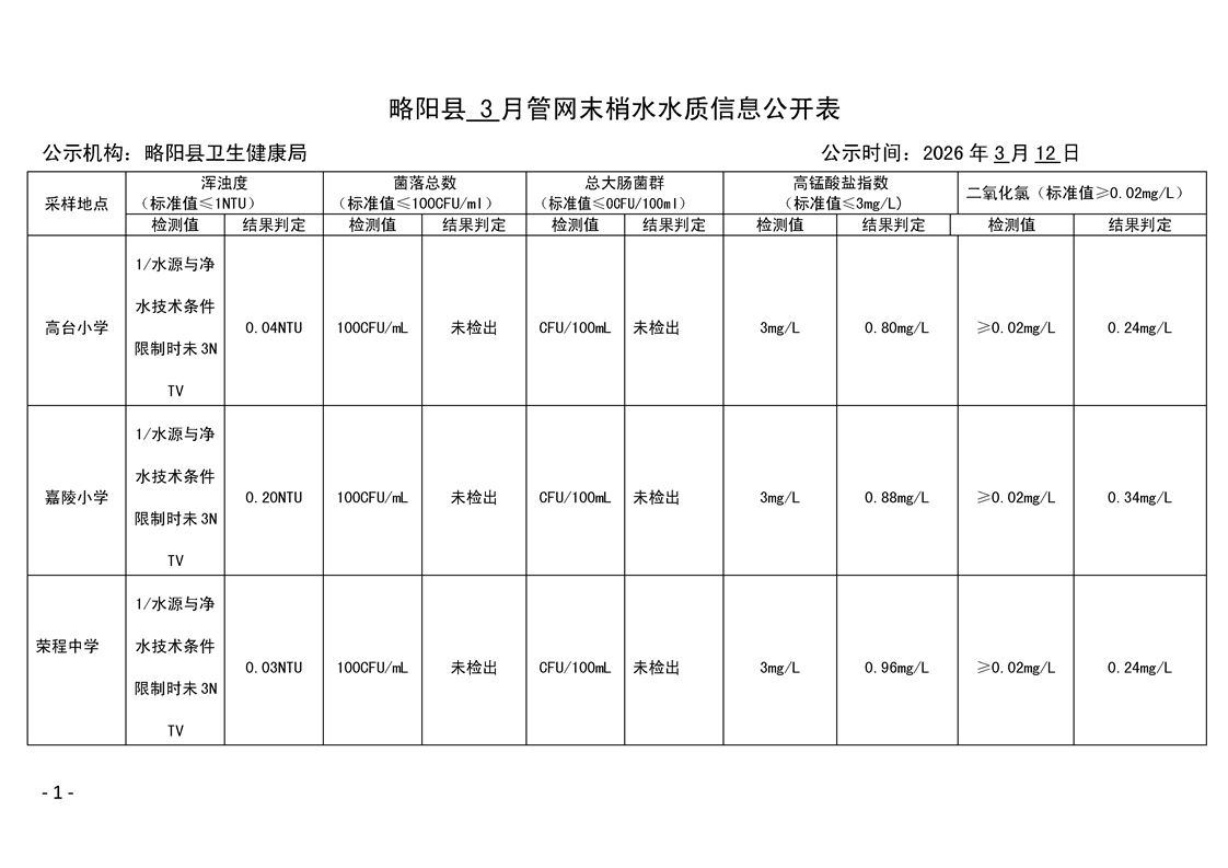 略阳县2026年3月管网末梢水水质信息公开表