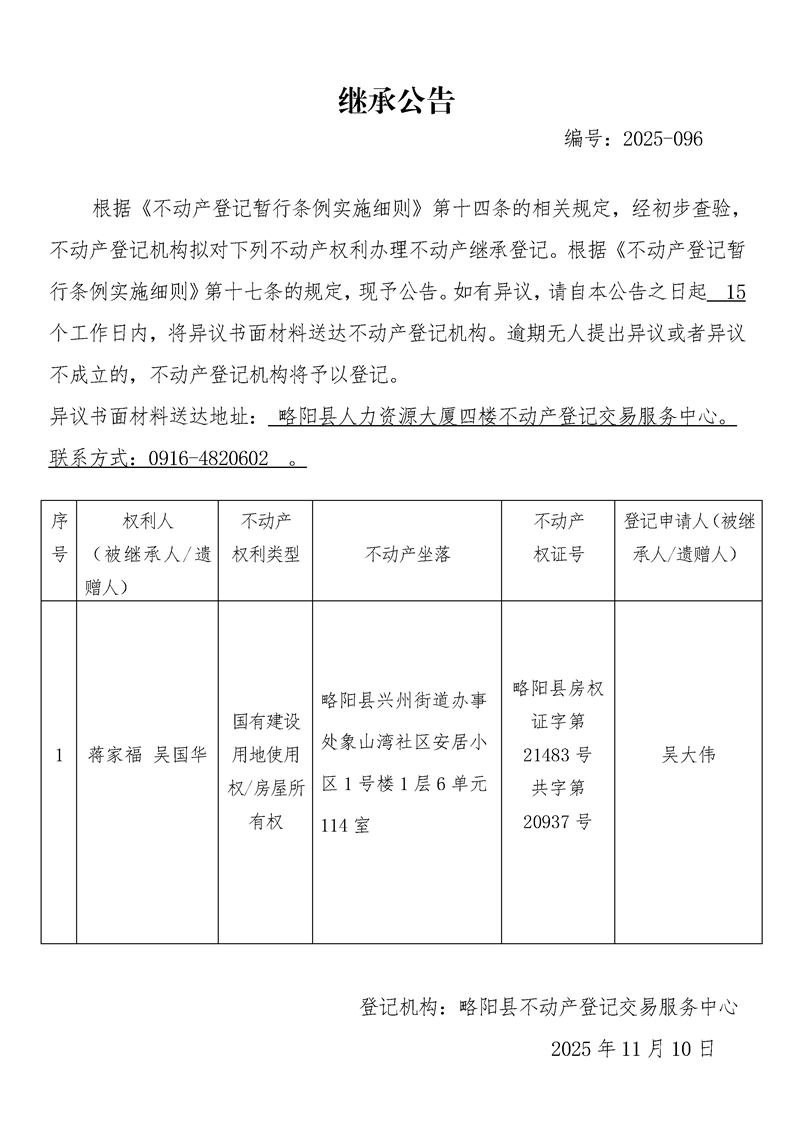 继承公告编号:2025-096