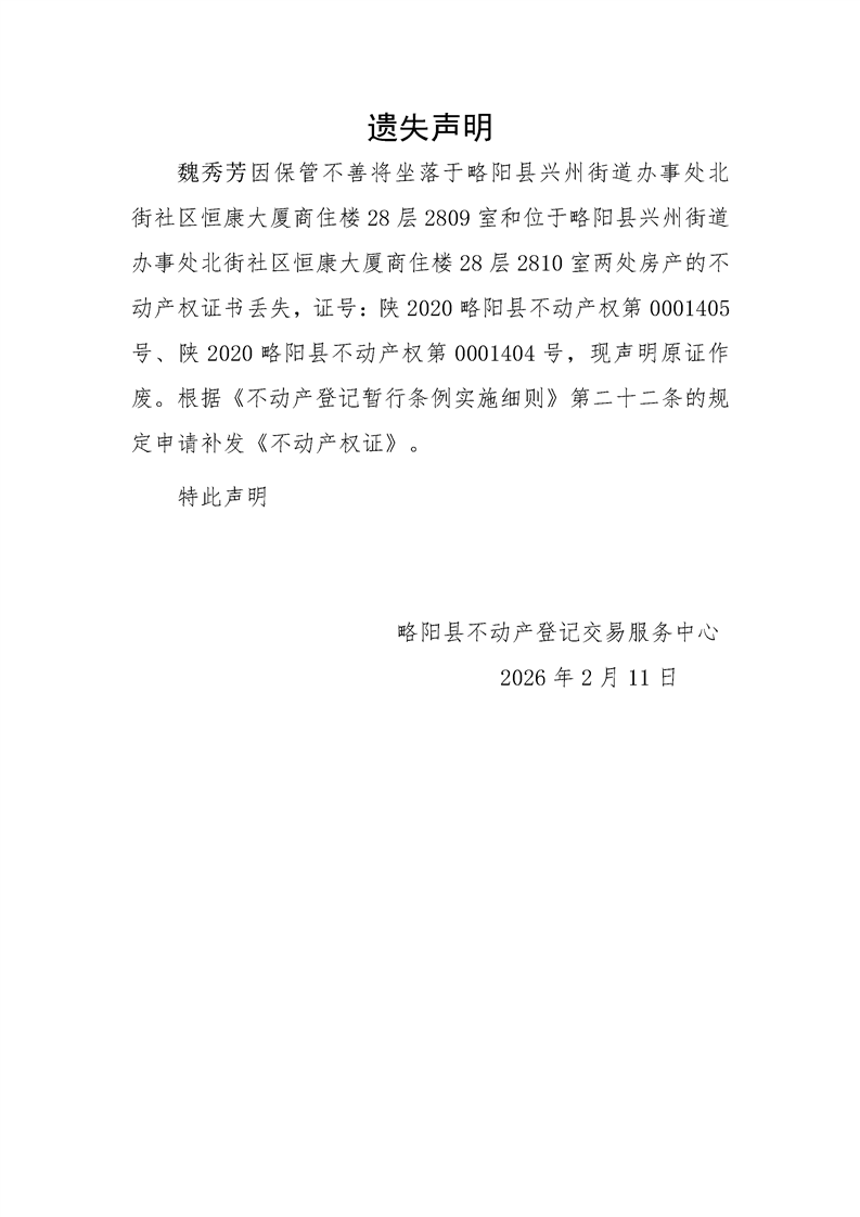 魏秀芳房产证遗失声明