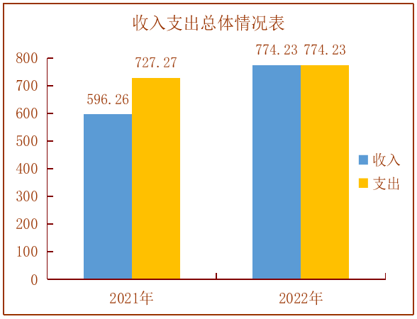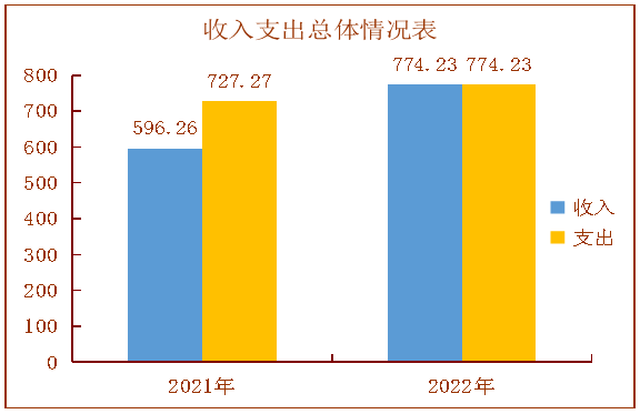 2022年度收入总计、支出总计均为774.23万元,与上年相比收入增加177.97万元,增长29.85%,主要是秦岭生态环保西淮坝小水电整治项目收入增加;支出增加46.96万元,增长6.46%,主要是秦岭生态环保西淮坝小水电整治项目支出增加。