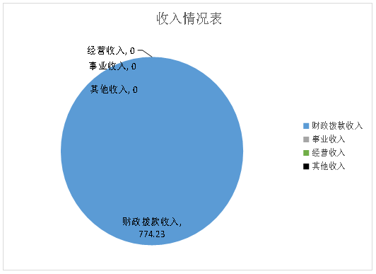 2022年度本年收入合计774.23万元,其中:财政拨款收入774.23万元,占100%;事业收入0万元,占0%;经营收入0万元,占0%;其他收入0万元,占0%。