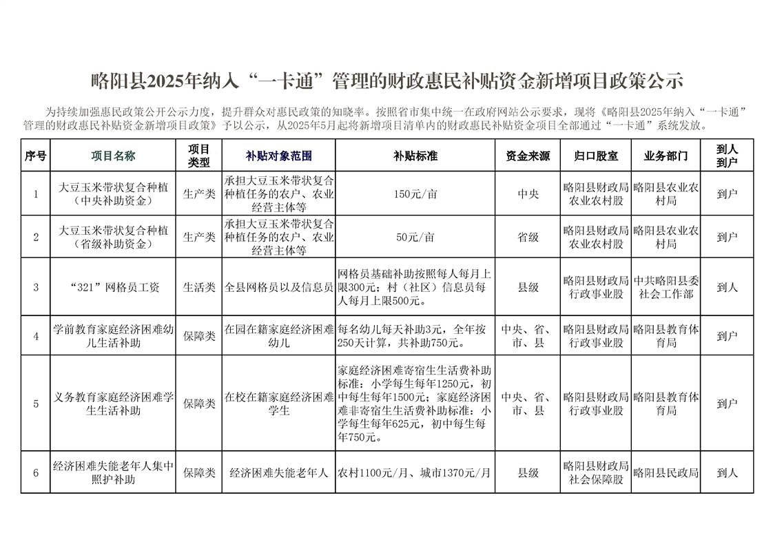 | 内容概述 | 略阳县2025年纳入“一卡通”管理的财政惠民补贴资金新增项目政策公示 | ||||