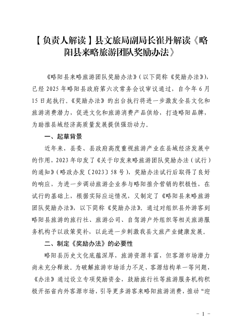 | 内容概述 | 【负责人解读】县文旅局副局长崔丹解读《略阳县来略旅游团队奖励办法》 | ||||