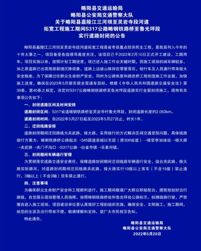 略阳县嘉陵江三河坝至灵岩寺段河道拓宽工程是省市县重点防洪民生工程,是我县列入今年的十件大事之一,项目备受各级领导高度关注,该项目已于2022年2月10日正式开工建设,工期两年。项目实施以来,按照计划工期进度,现已进入施工作业关键时期,因施工现场机械车辆较多,加之原道路已出现局部裂缝沉降现象,道路上边坡山体存在零星落石,给行车及人员通行带来极大安全隐患。为了保障过往群众生命财产安全,同时为公路恢复和路改桥工程创造施工作业面,加快施工进度,确保在2023年5月前实现全面通车目标,根据《中华人民共和国道路交通安全法》第39条、第40条之规定,决定对S317公路略钢铁路桥至鲁光坪段道路实行全面封闭施工,现将有关事项公告如下:
