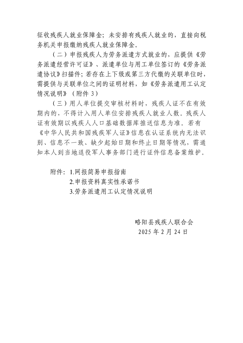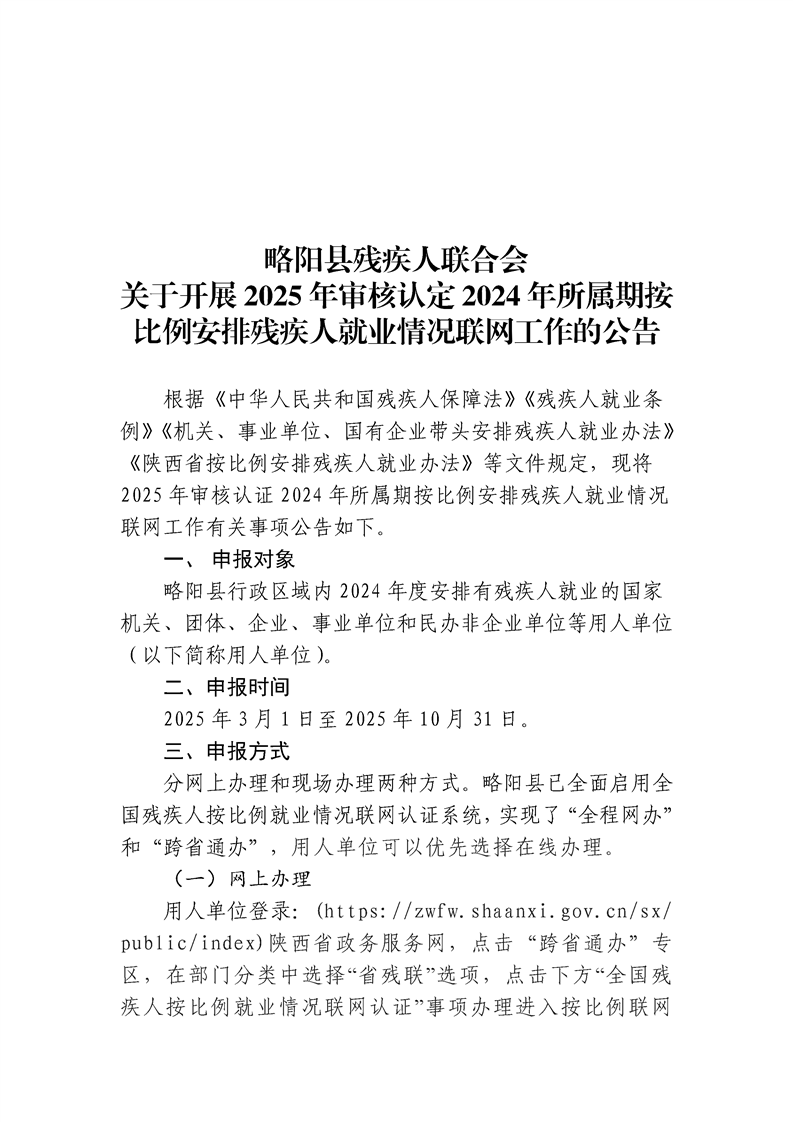 | 内容概述 | 略阳县残疾人联合会关于开展2025年审核认定2024年所属期按比例安排残疾人就业情况联网工作的公告 | ||||