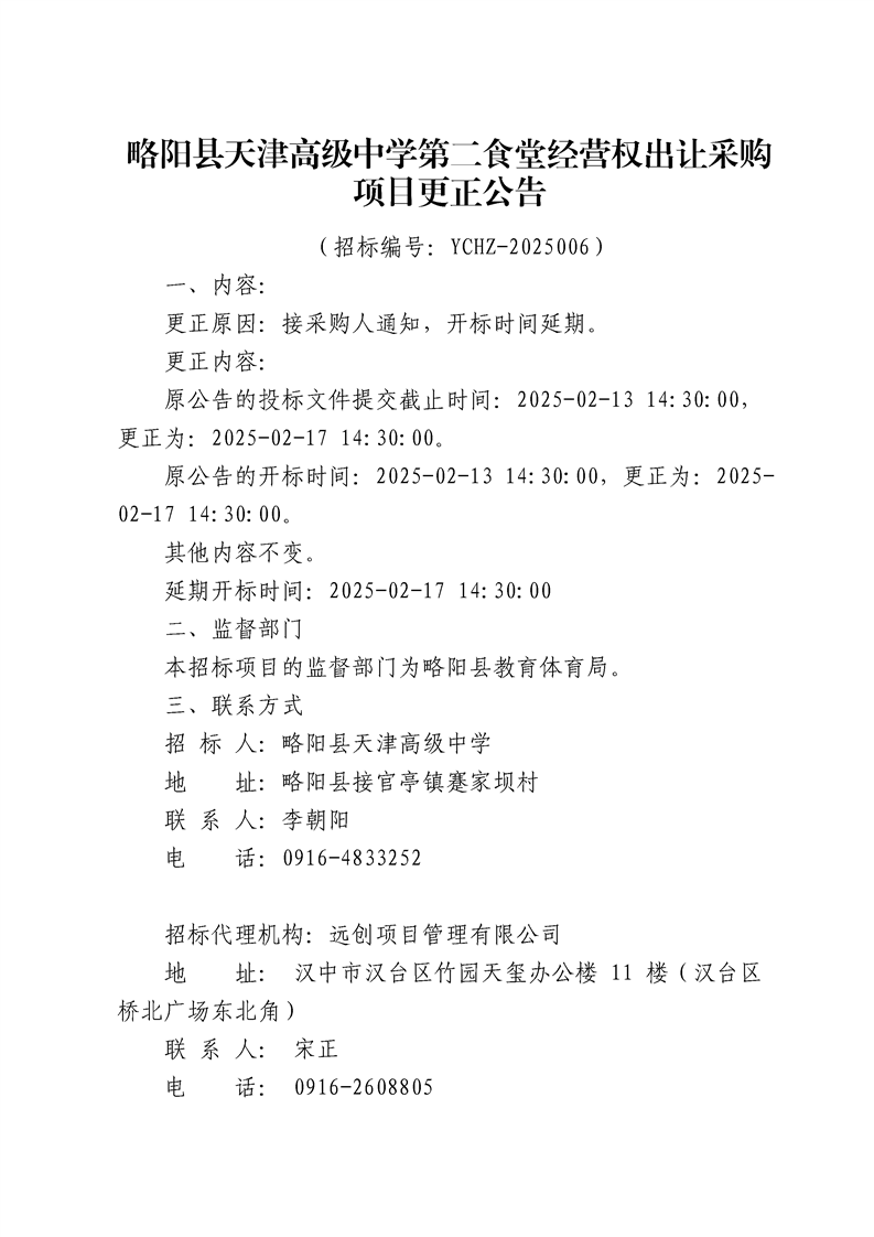 略阳县天津高级中学第二食堂经营权出让采购项目更正公告