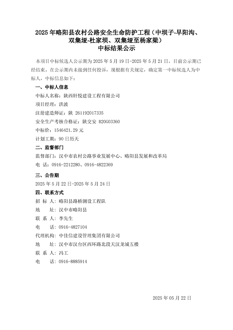 | 内容概述 | 2025年略阳县农村公路安全生命防护工程(中坝子-早阳沟、双集垭-杜家坝、双集垭至杨家梁)中标结果公示 | ||||