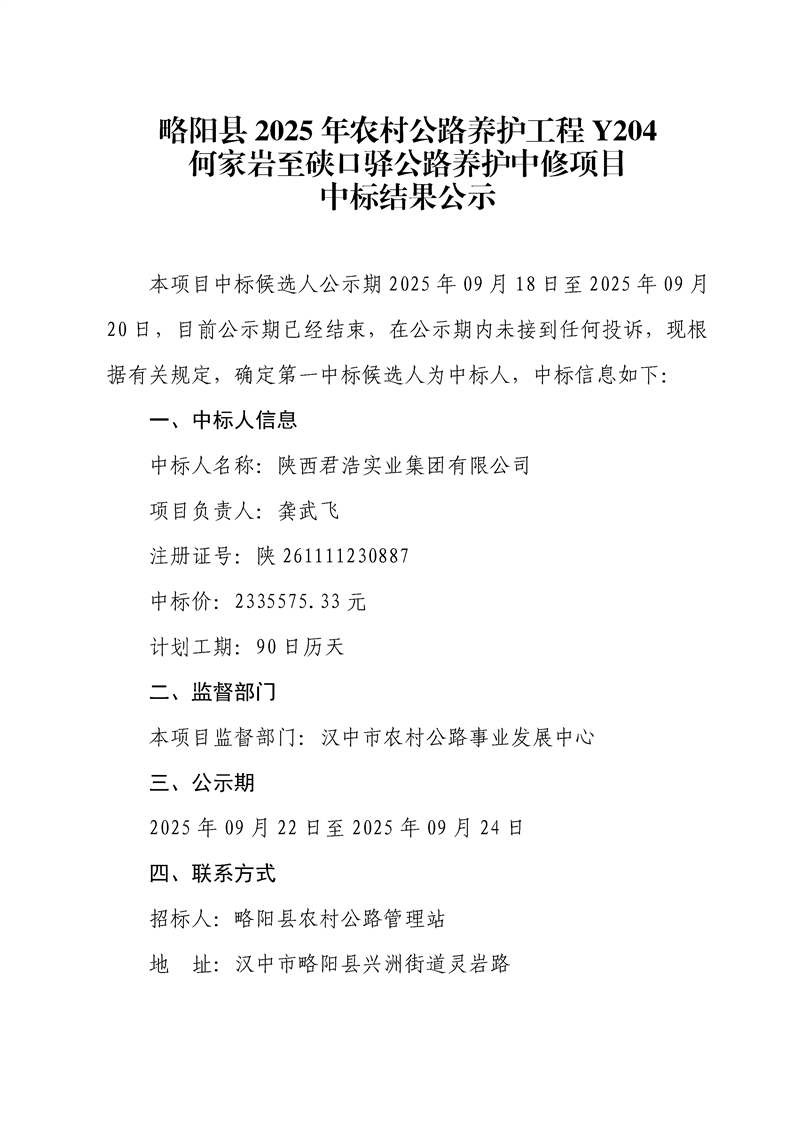 内容概述 | 略阳县2025年农村公路养护工程Y204何家岩至硖口驿公路养护中修项目中标结果公示 |