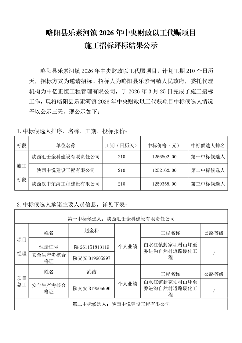 略阳县乐素河镇2026年中央财政以工代赈项目施工招标评标结果公示