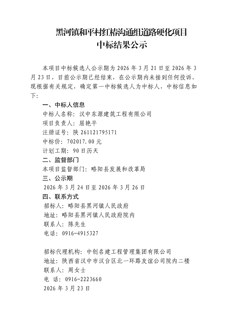 黑河镇和平村红椿沟通组道路硬化项目中标结果公示