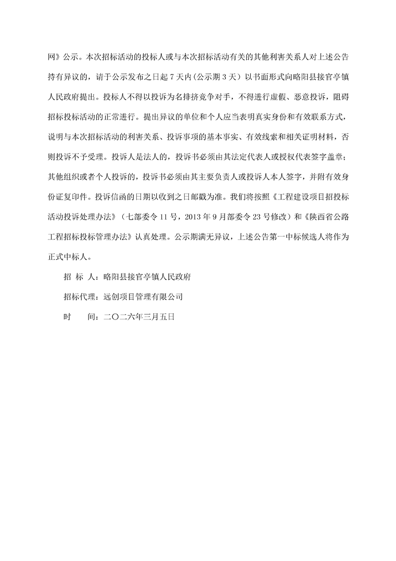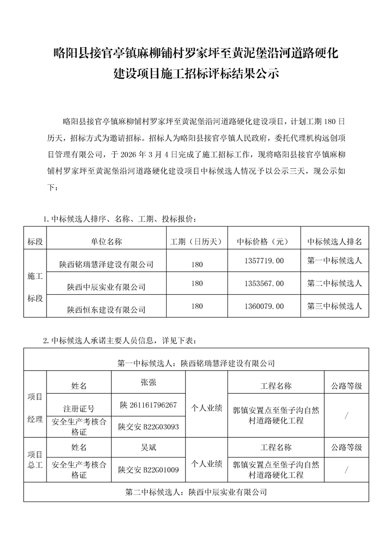 | 内容概述 | 略阳县接官亭镇麻柳铺村罗家坪至黄泥堡沿河道路硬化建设项目施工招标评标结果公示 | ||||