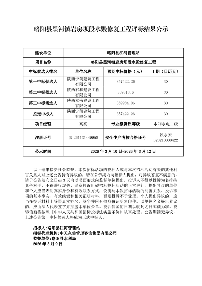 略阳县黑河镇岩房坝段水毁修复工程评标结果公示