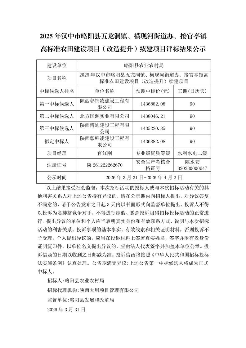 | 内容概述 | 2025年汉中市略阳县五龙洞镇、横现河街道办、接官亭镇高标准农田建设项目(改造提升)续建项目评标结果公示 | ||||