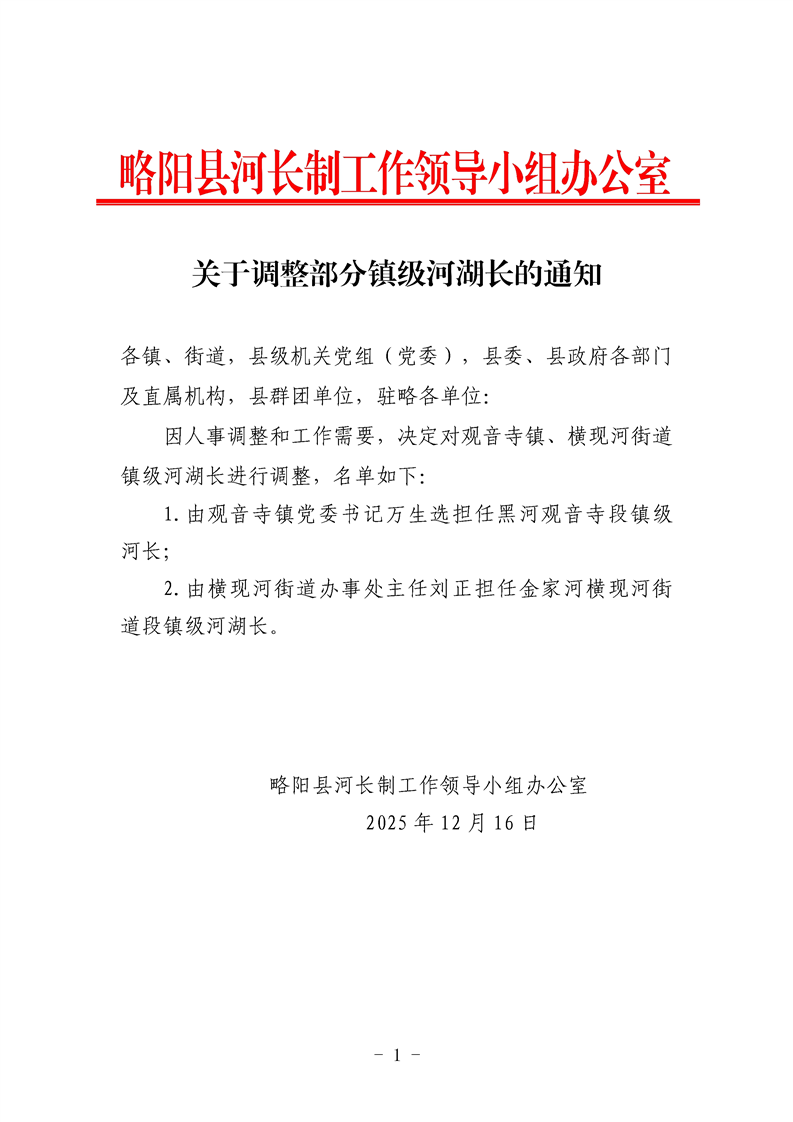 关于调整部分镇级河湖长的通知