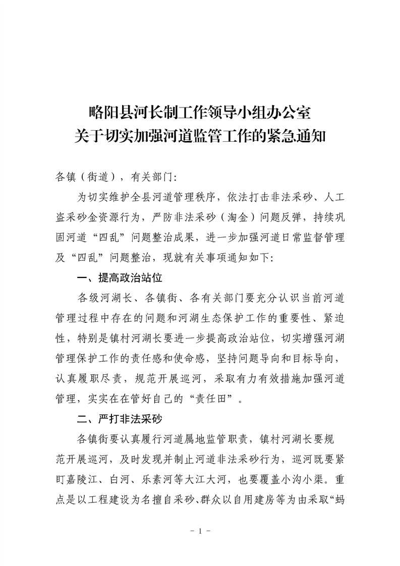 略阳县河长制工作领导小组办公室关于切实加强河道监管工作的紧急通知