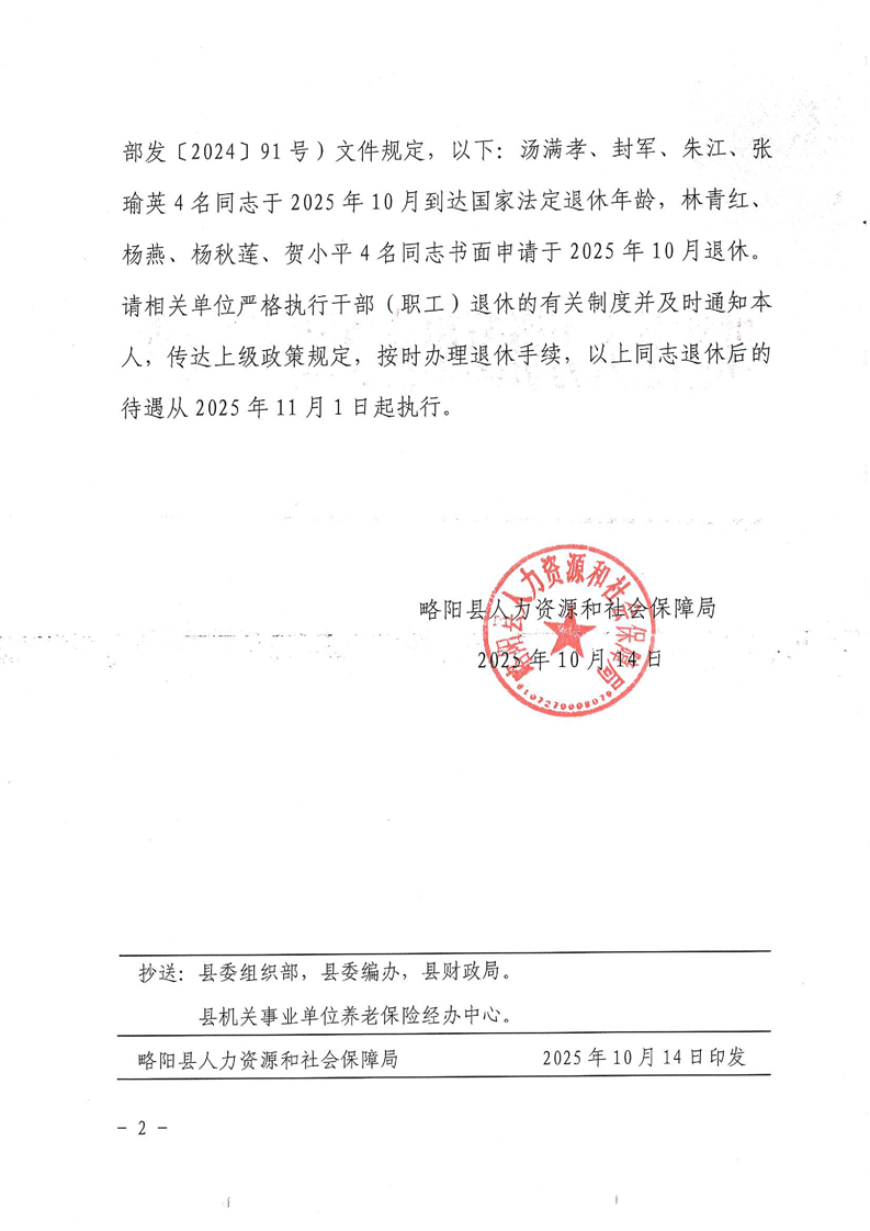 略阳县人力资源和社会保障局关于汤满孝等8名同志退休的通知