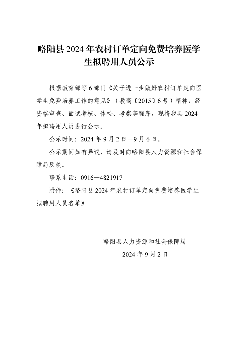 略阳县2024年农村订单定向免费培养医学生拟聘用人员公示