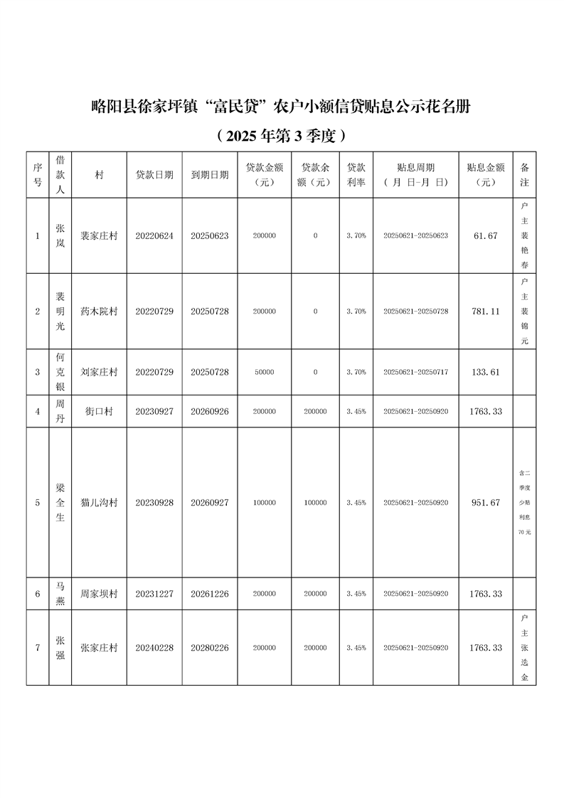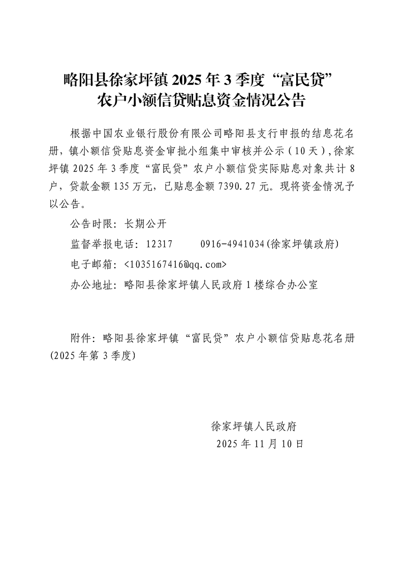 | 内容概述 | 略阳县徐家坪镇2025年3季度“富民贷”农户小额信贷贴息资金情况公告 | ||||