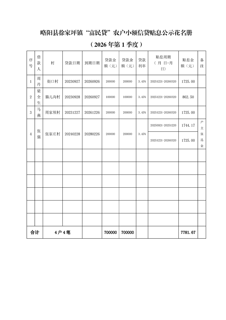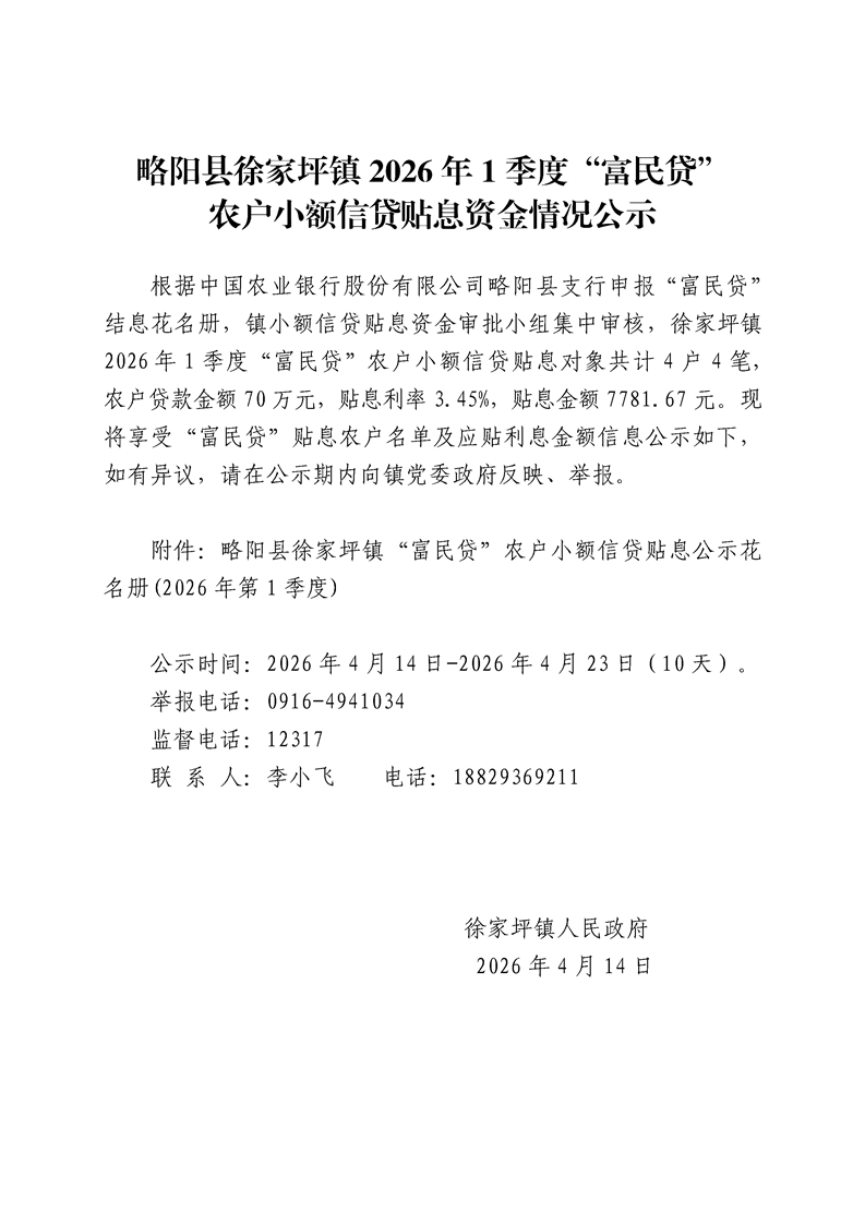 | 内容概述 | 略阳县徐家坪镇2026年1季度“富民贷”农户小额信贷贴息资金情况公示 | ||||