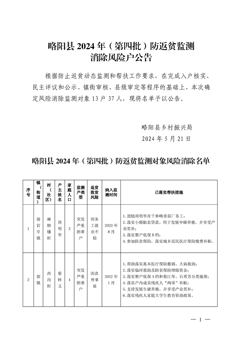 略阳县2024年(第四批)防返贫监测消除风险户公告