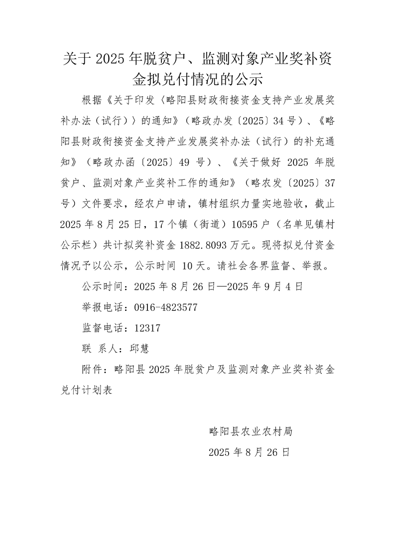 关于2025年脱贫户、监测对象产业奖补资金拟兑付情况的公示