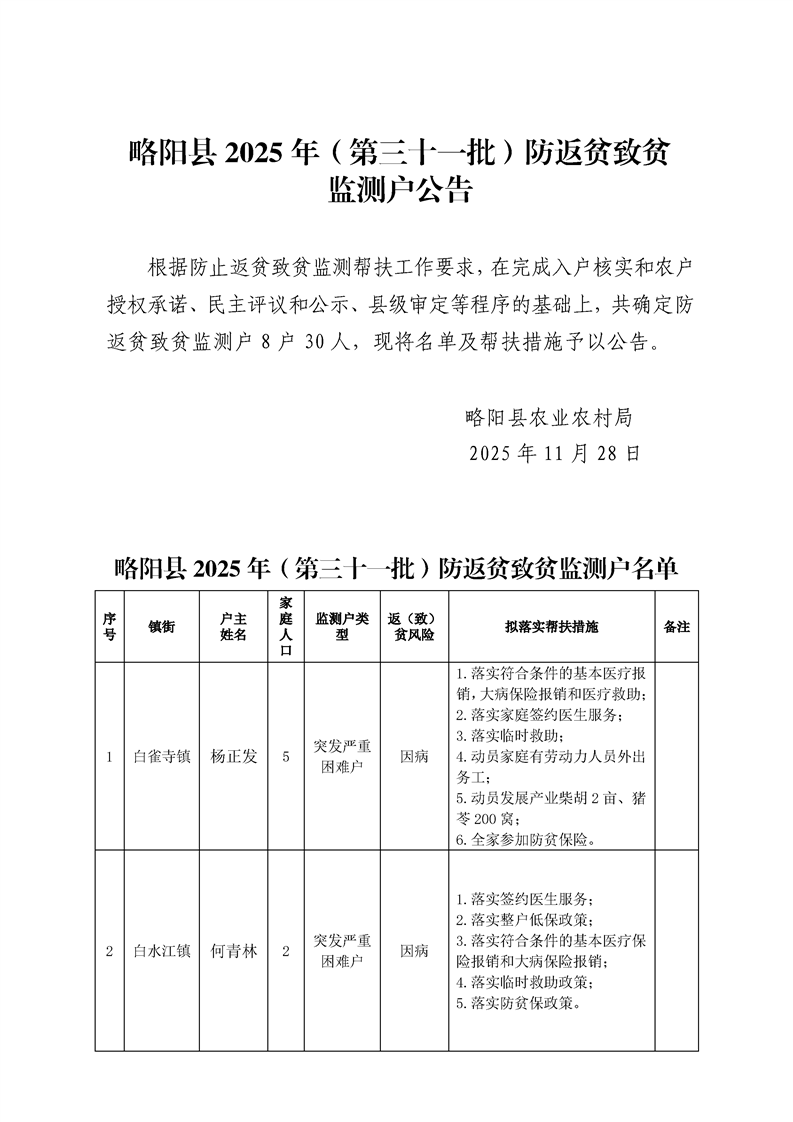 略阳县(第三十一批)防返贫致贫监测户公告